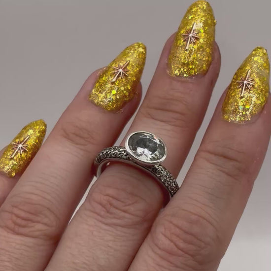Details: A dazzling clear stone (likely CZ), bezel-set on a sterling silver band, dotted with smaller sparkling stones.