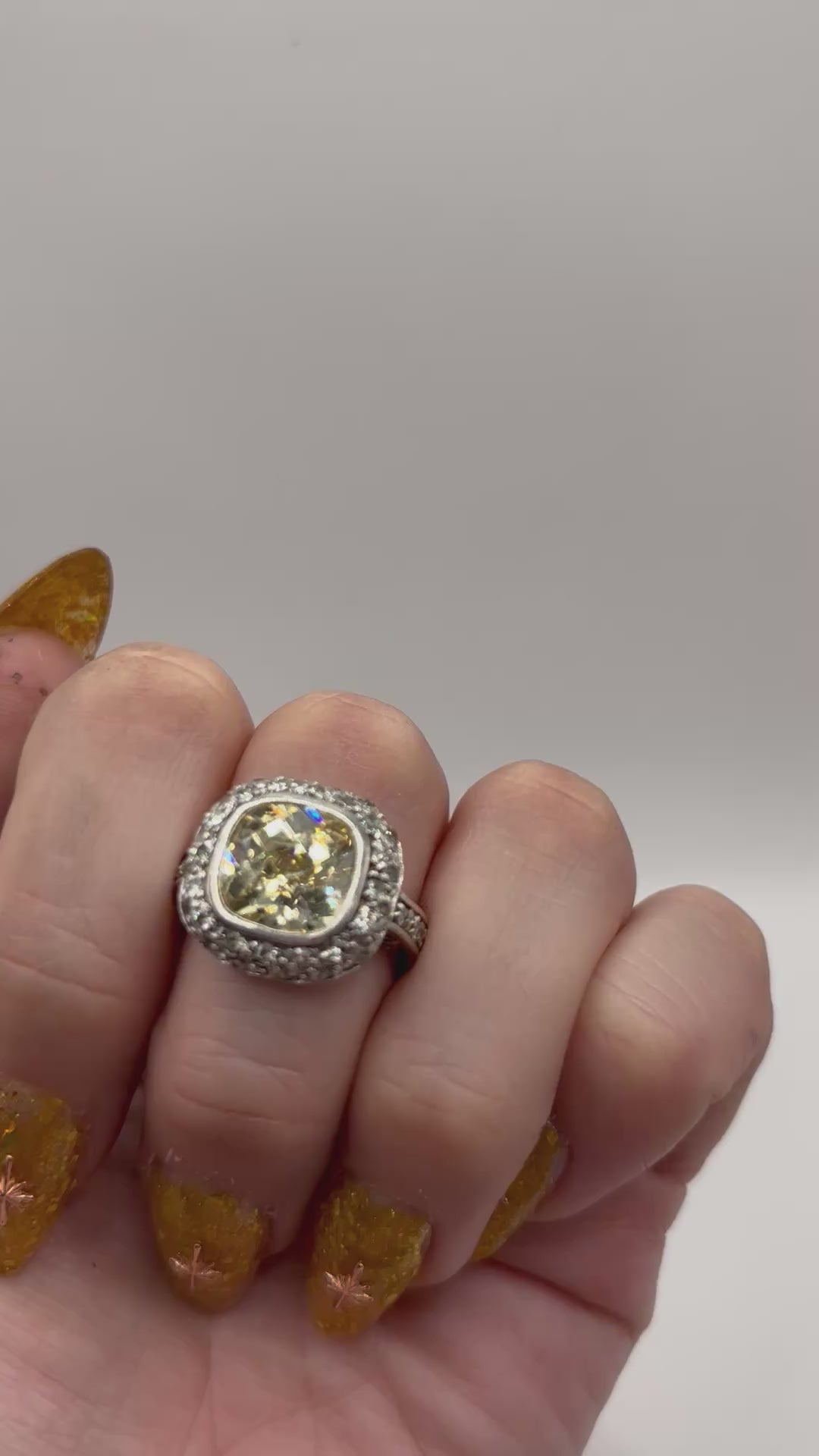 Details: This cocktail ring was designed to dazzle! It features a stunning, large faceted pale yellow stone (likely CZ), framed with smaller, clear stones that continue on the shoulders of the band.