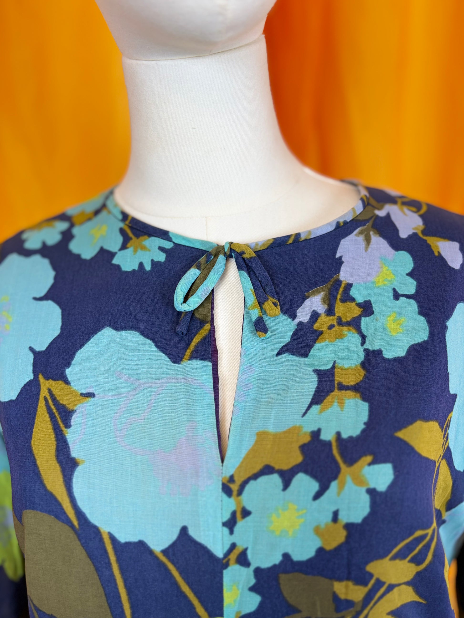 Details: This is an adorable example of a classic 1970s shift dress! It features a charming floral print in blues and greens. There is a zip and hook at the centre back to fasten. The neckline features a cute keyhole detail, with two ties to be fashioned into a small bow. Lovely shift-dress shape. Slight gathering at the hem of the sleeves. There was originally a button fastening at the cuff, but this has been stitched closed by a previous owner. This could be easily reversed if desired! Fully lined