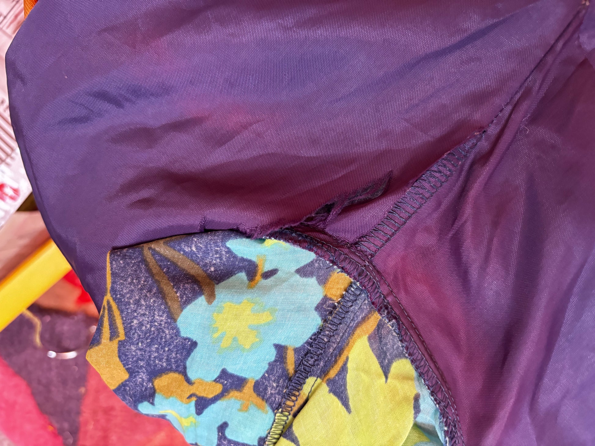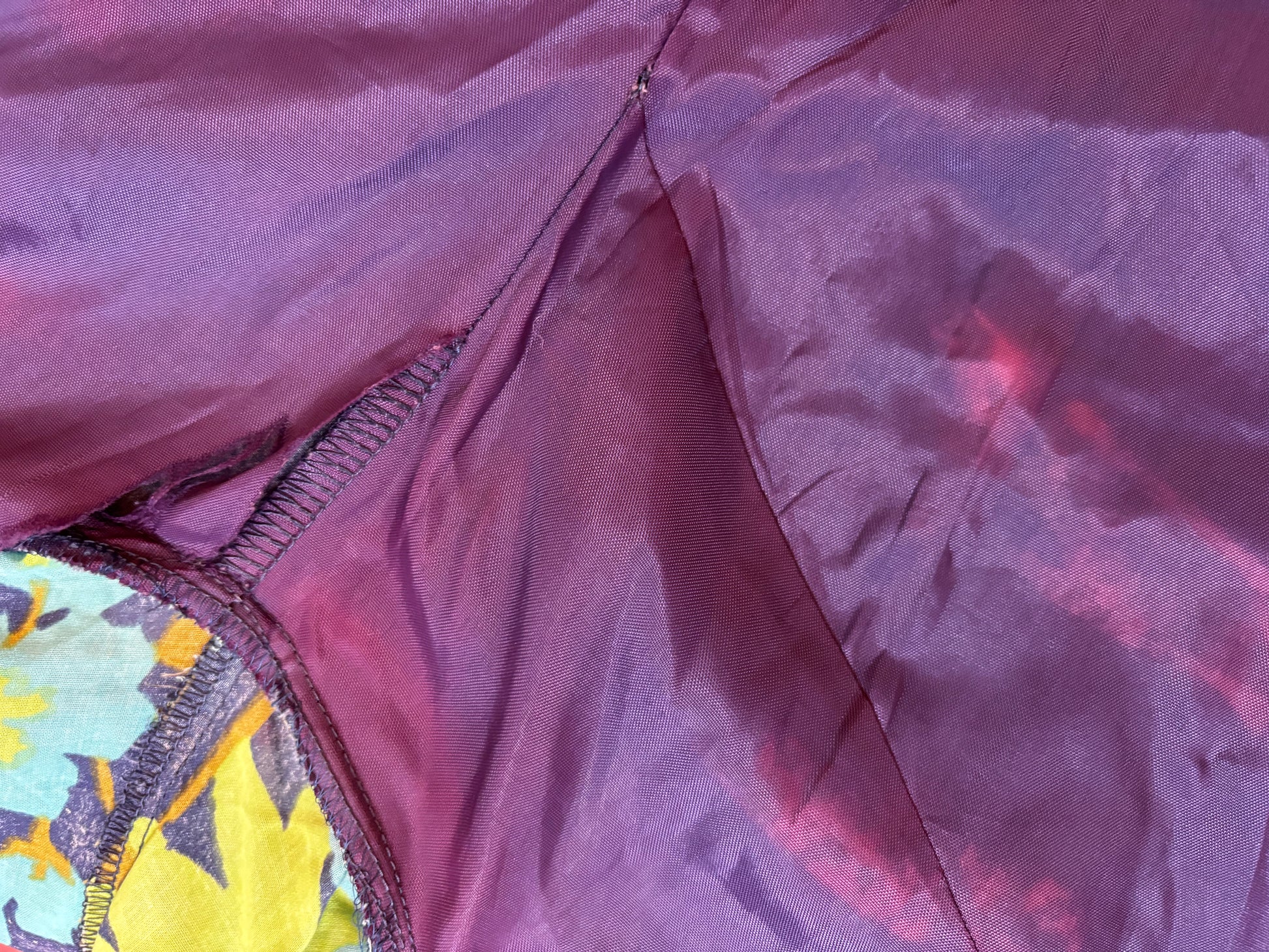 Condition: Good - the fabric is very light and delicate, so there is minor bobbling and also small white flecks of the original fabric colour from the dying/printing process. The lining has some rips under the arms, and colour bleaching as pictured. Not visible when being worn!