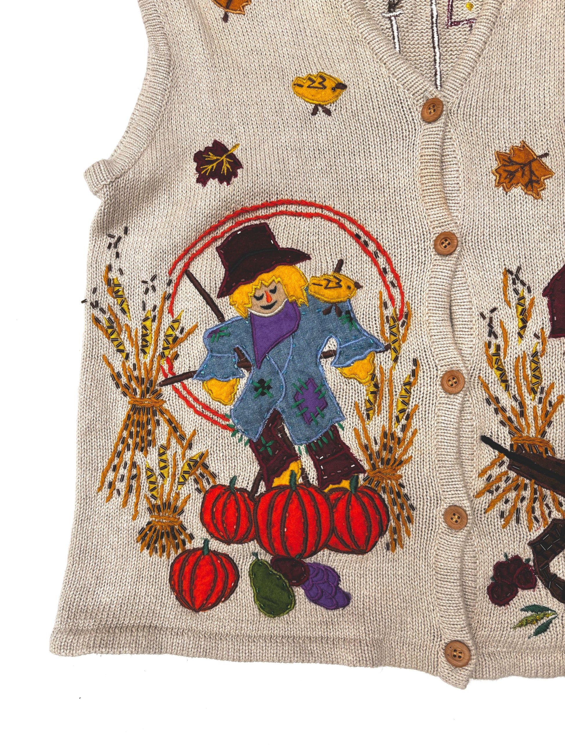 This charming knitted waistcoat is beige in colour, and embodies everything autumnal and harvest time! It features a scruffy yet sweet scarecrow on one side, surrounded by hay, pumpkins and other autumnal bounties, all adorned with embroidery and some beaded embellishments. The back features a trio of birdhouses in the centre. Cotton and ramie mix.