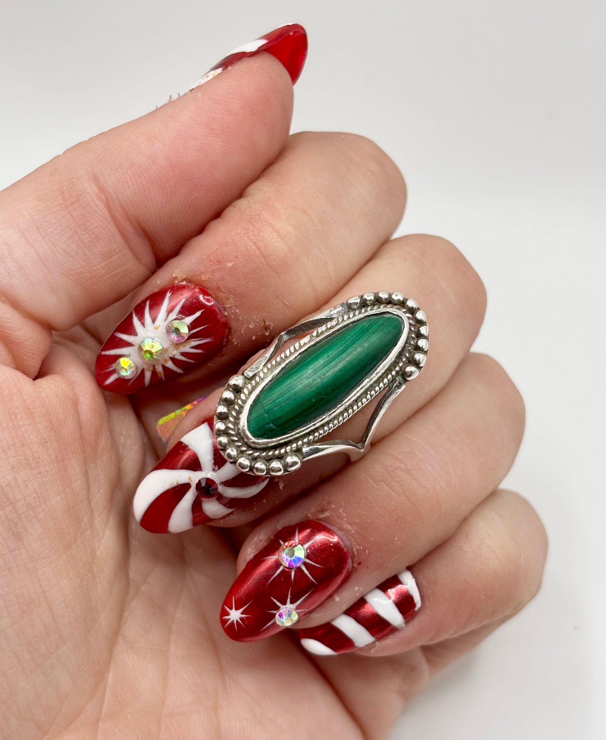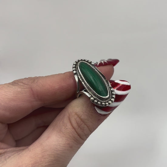 Details: A striking oblong malachite is the centrepiece on this navajo ring. The stone is bezel-set in sterling silver and framed with a silver braided detail and split shoulder detailing. Not only is malachite a gorgeous green hue with striking striations, but it is also believed to absorb negative energy and encourage spiritual healing in the wearer.