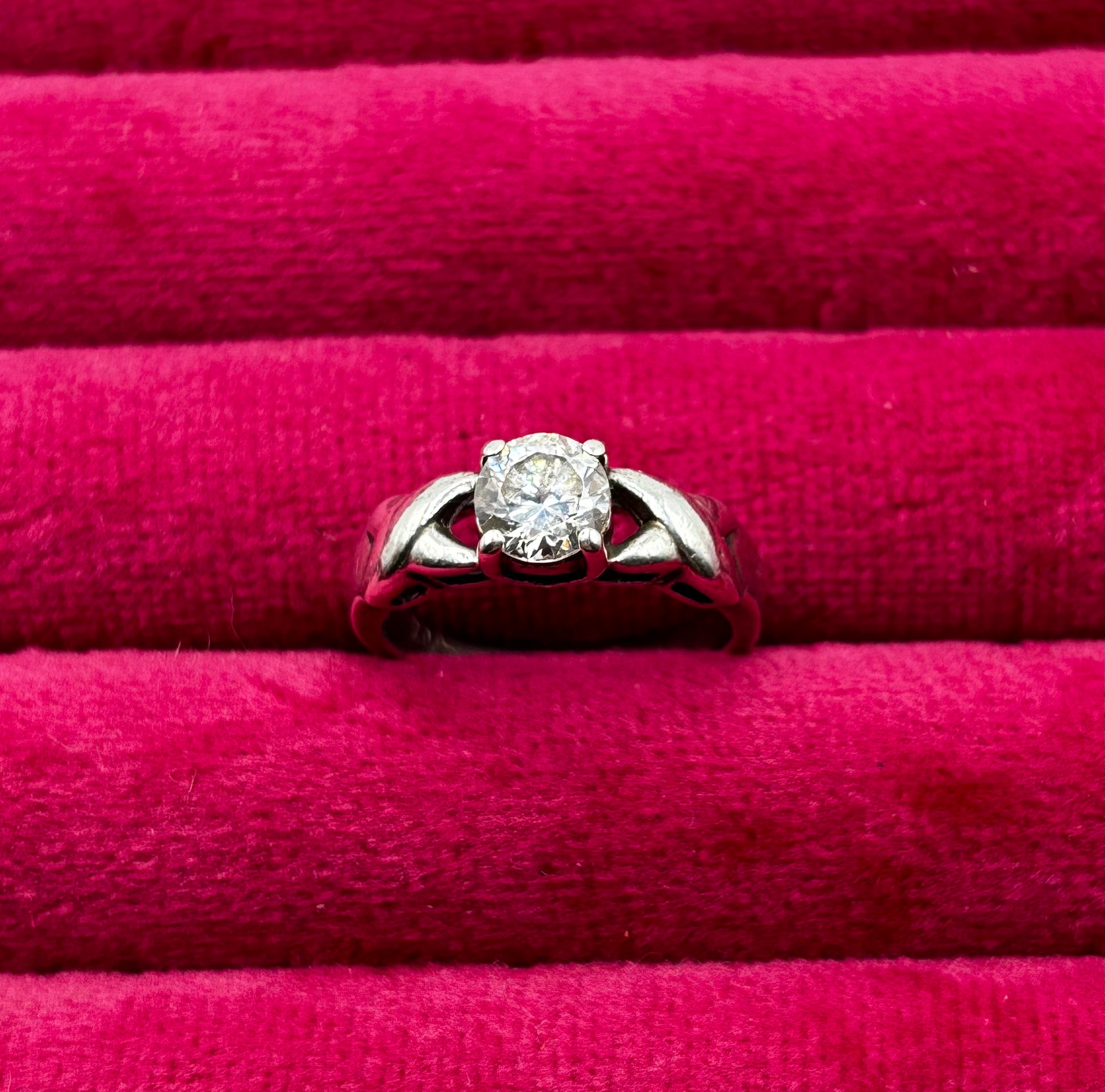 Details: Simple solitaire ring, with cross detail on the shoulders and a clear stone (likely CZ) in a prong setting.