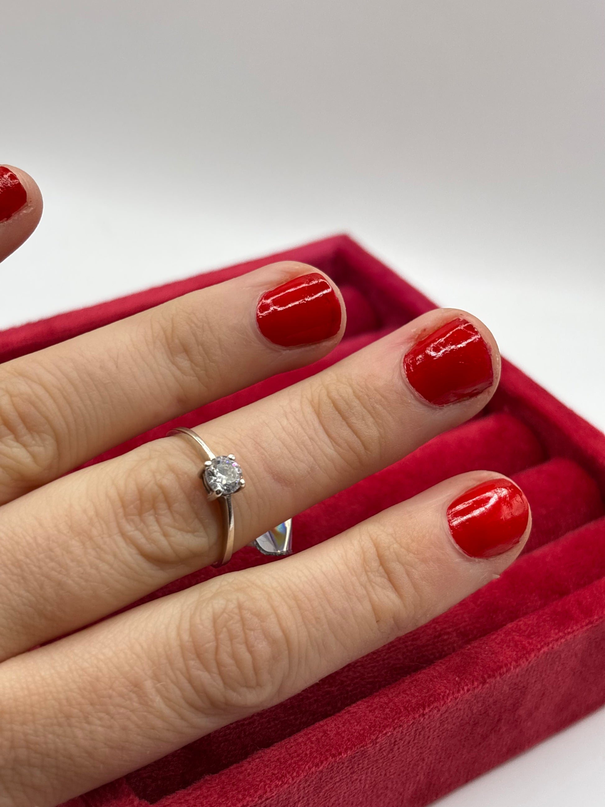 Details: Simple classic solitaire ring with a clear gemstone at the centre (likely cz).