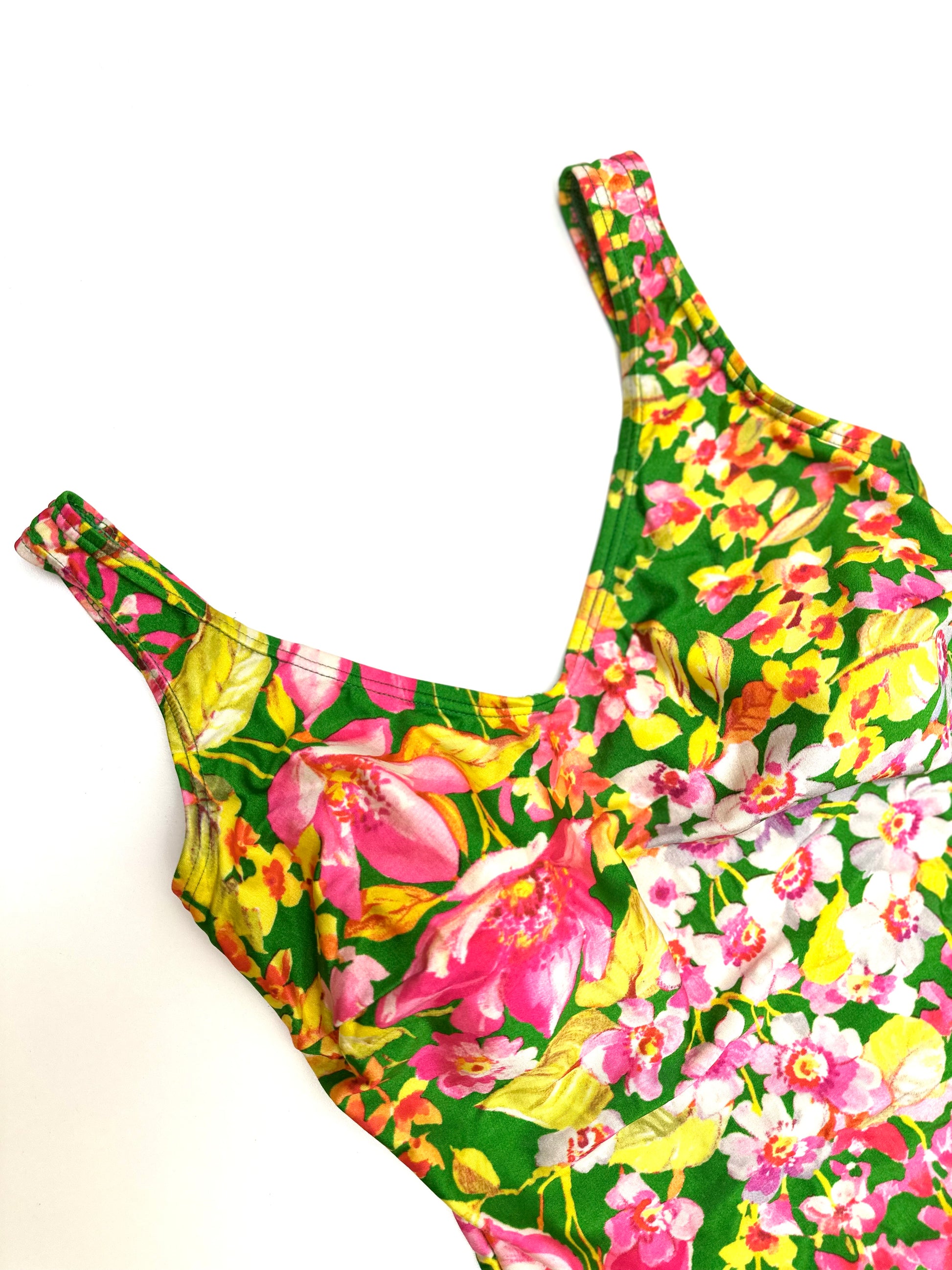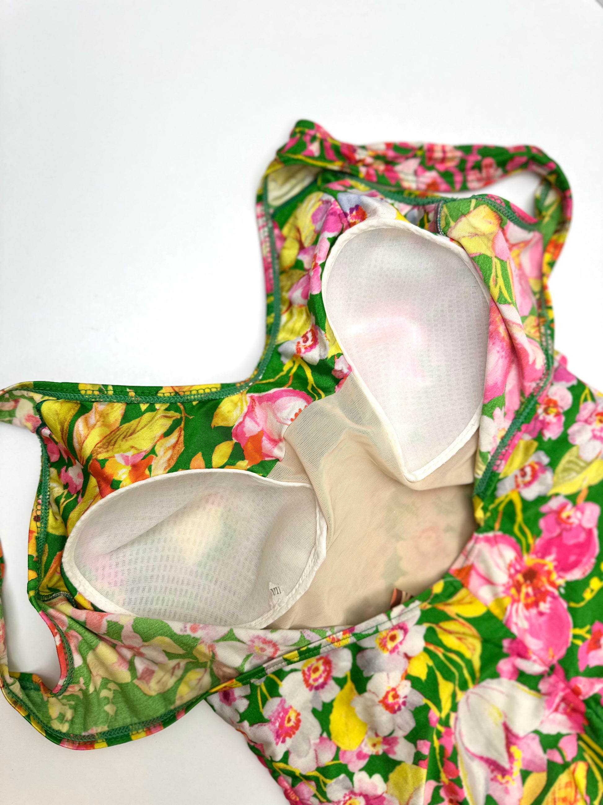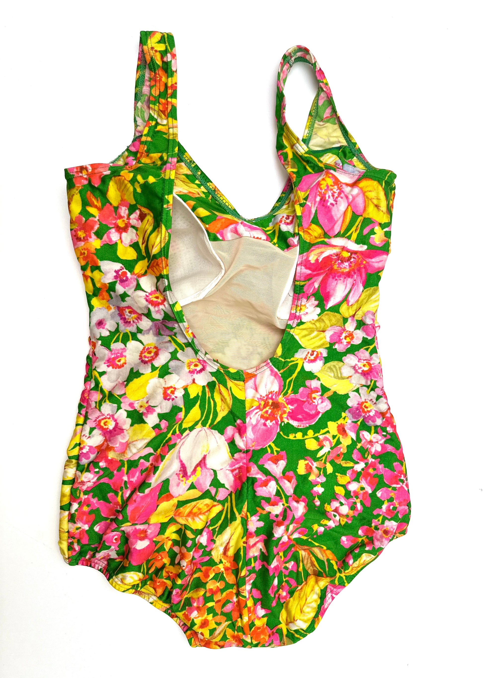 Details: A step up from the 1950s corsetted swimsuits, this 60s/70s design features internal moulded cups and a tight stretch spandex lining to smooth the curves. The print is bright and cheerful with small flowers in green, yellow and pink hues. The shape is classic of its time, with a low back and low-cut legs. This swimsuit is giving decadent Palm Springs holiday vibes, pair with a cocktail and a sheer houserobe, to embody your inner Jennifer Coolidge