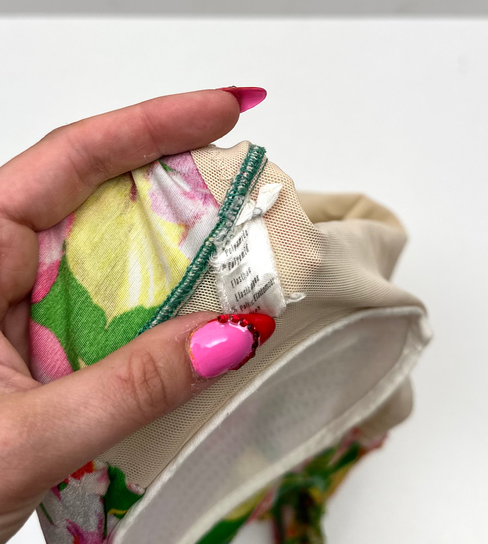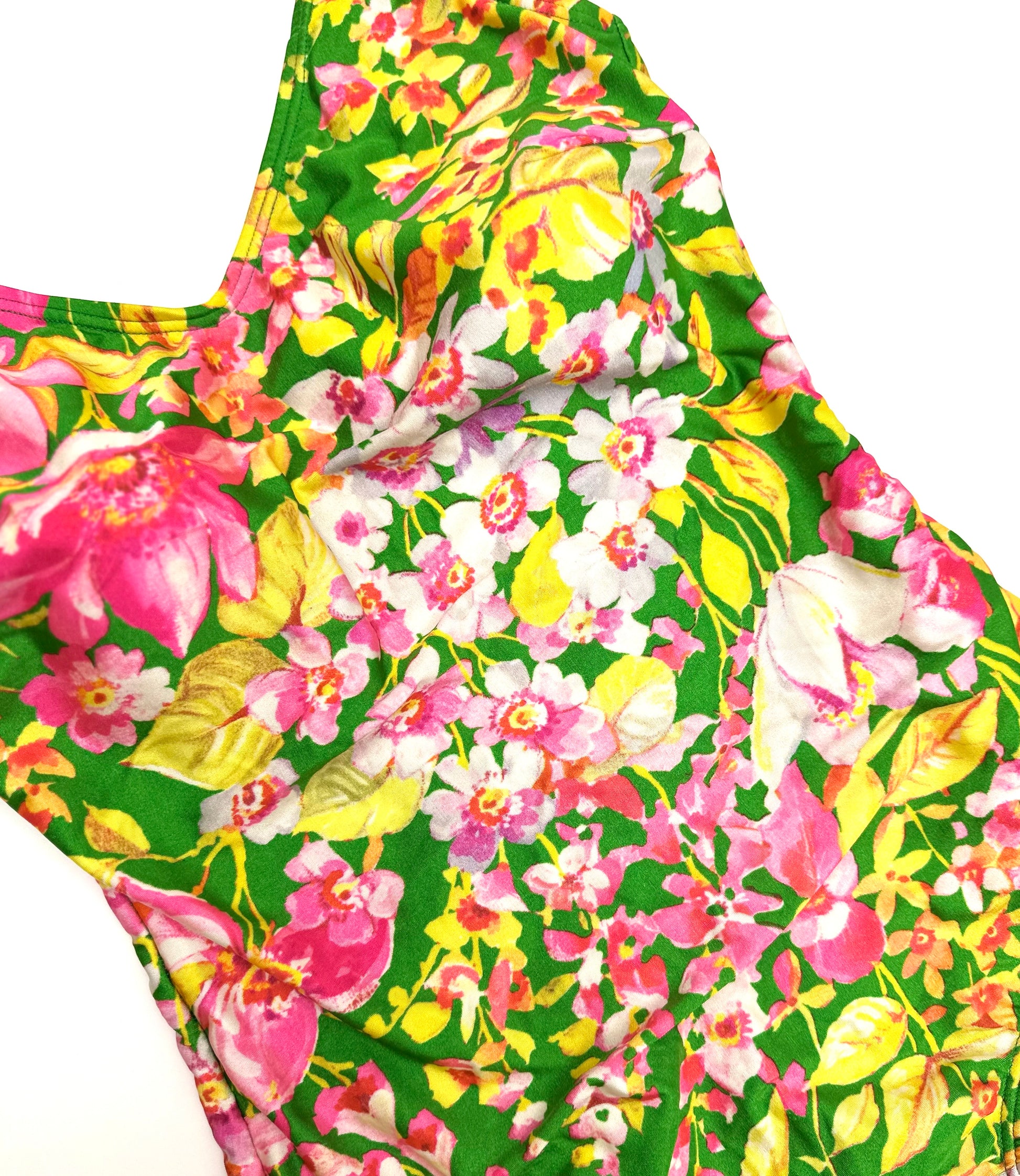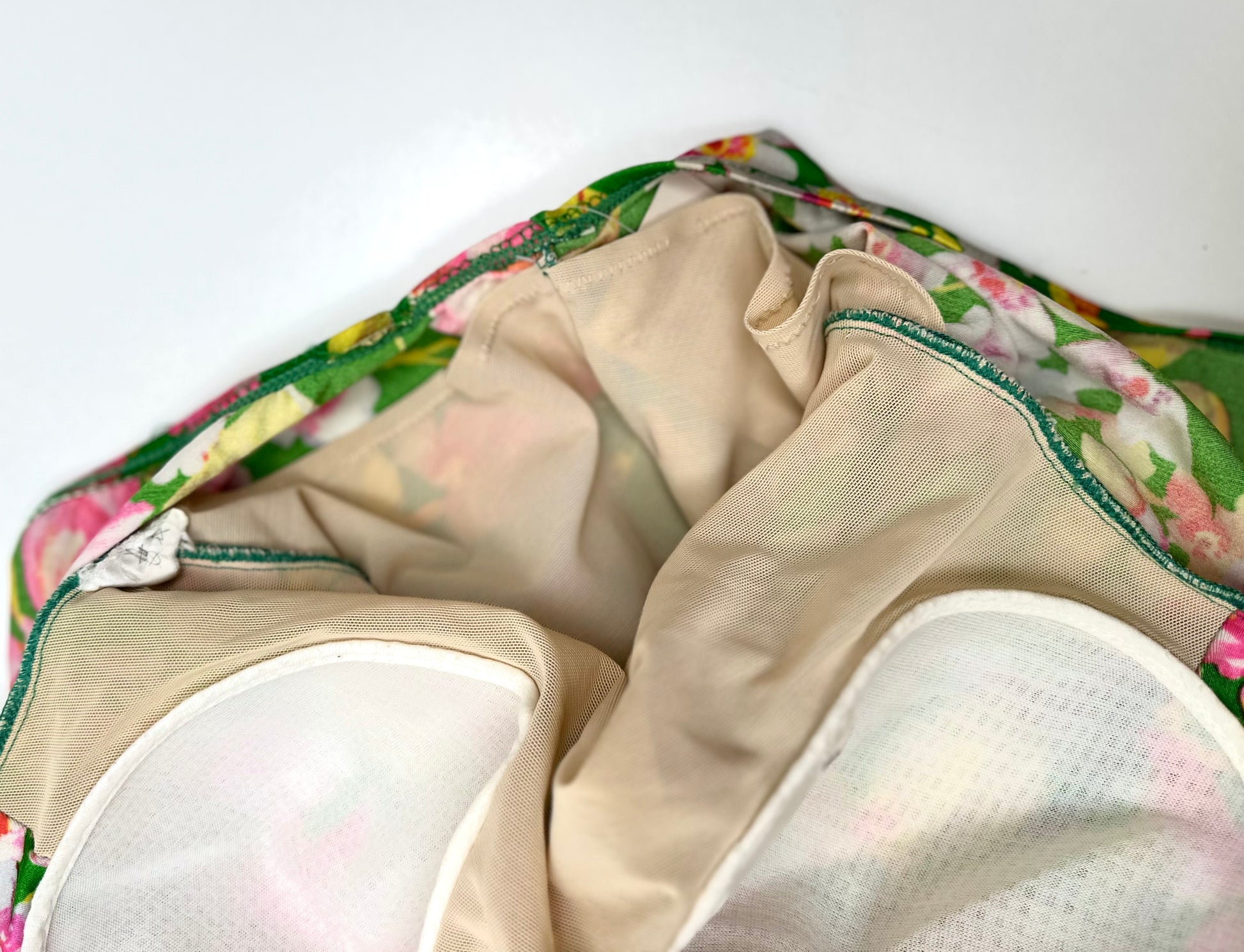 Details: A step up from the 1950s corsetted swimsuits, this 60s/70s design features internal moulded cups and a tight stretch spandex lining to smooth the curves. The print is bright and cheerful with small flowers in green, yellow and pink hues. The shape is classic of its time, with a low back and low-cut legs. This swimsuit is giving decadent Palm Springs holiday vibes, pair with a cocktail and a sheer houserobe, to embody your inner Jennifer Coolidge