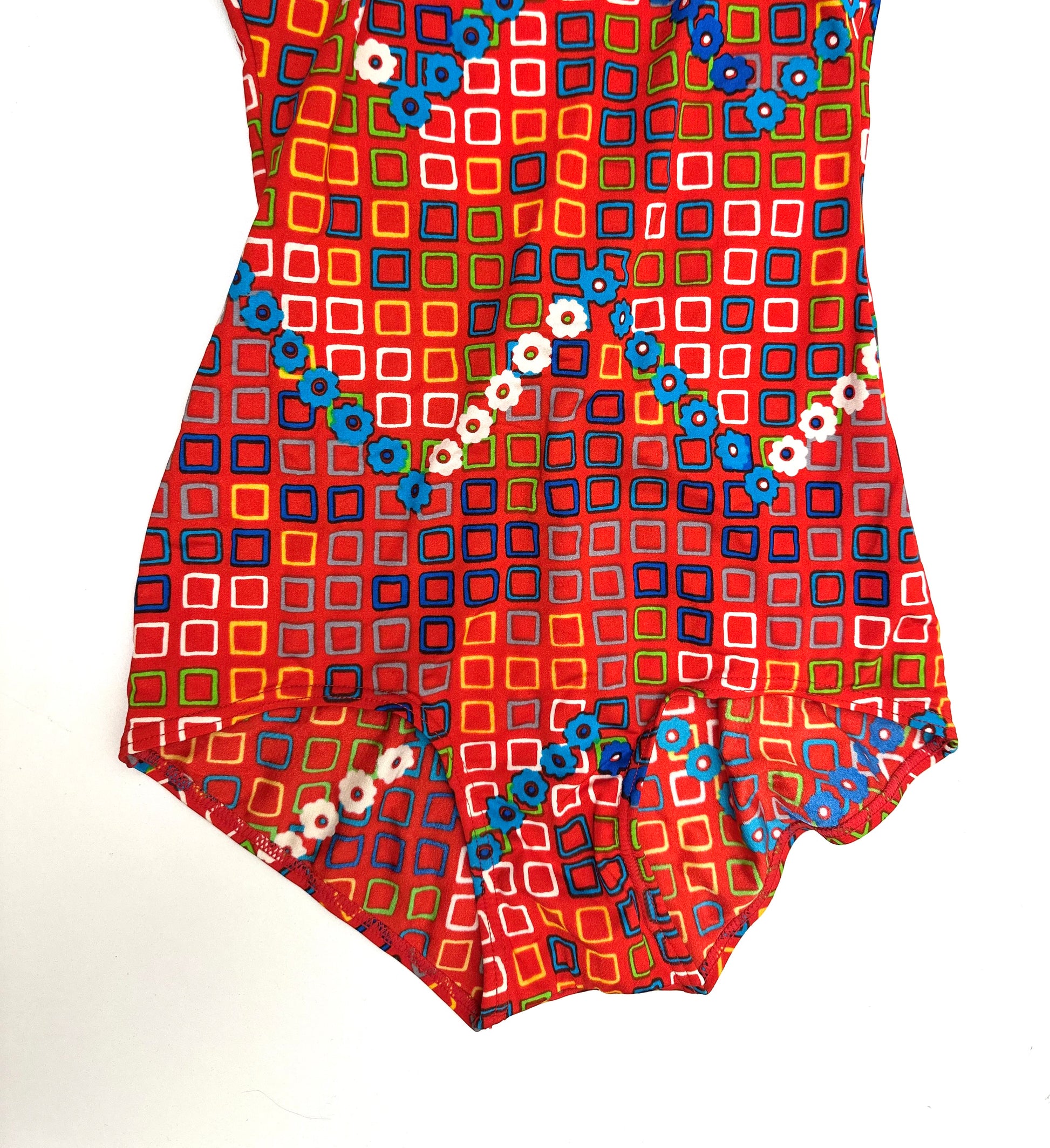Details: Bold and bright, this swimsuit is a showstopper. Constructed in the 70s from Lycra, the fabric has great stretch and colour longevity. The print features lots of small coloured squares on a deep red base, accented with flowers in a zig zag pattern - groovy baby! It is a classic swimsuit shape, with low-cut legs and a super low back. It also makes use of darts at the bust for additional shaping.