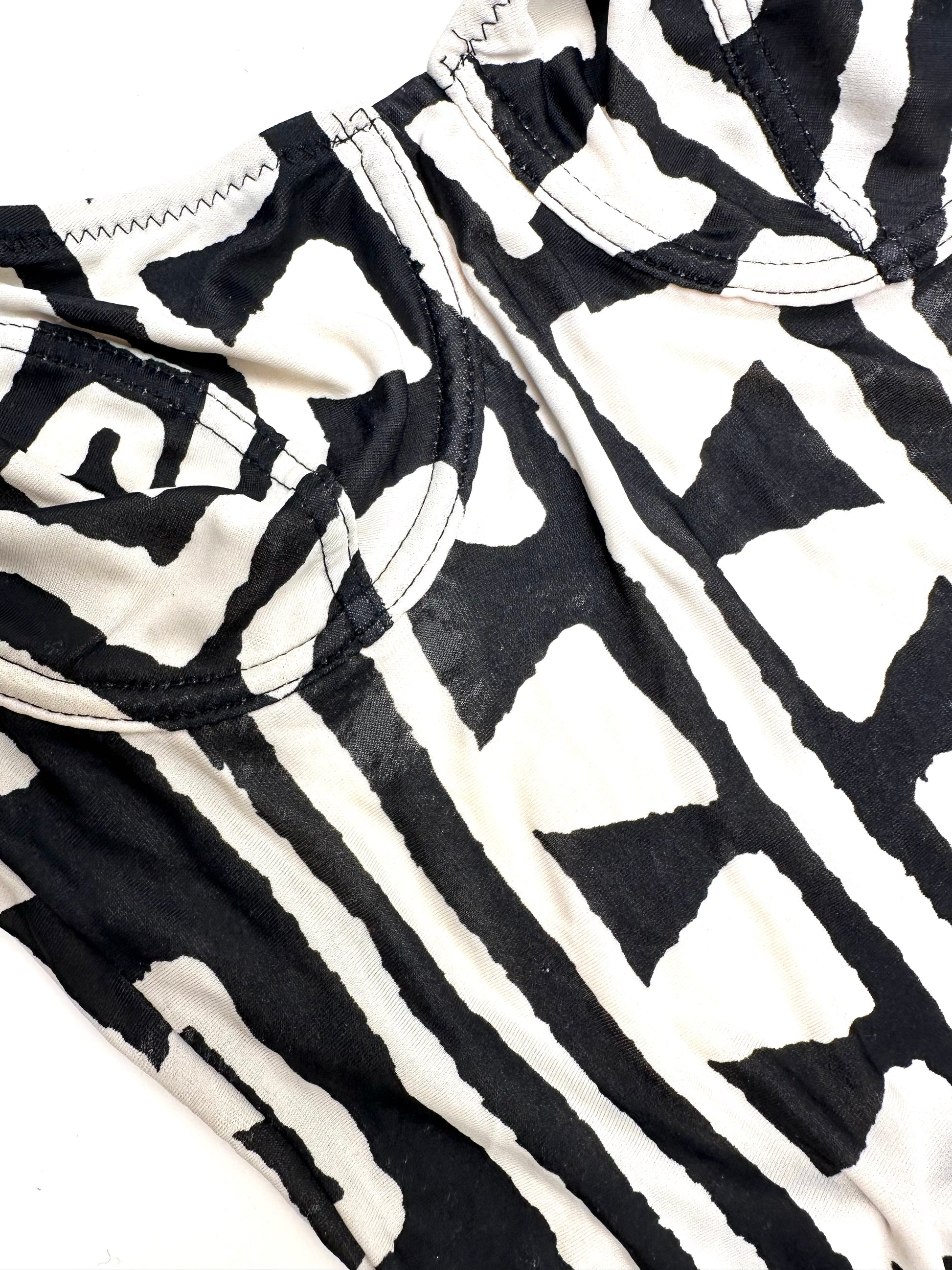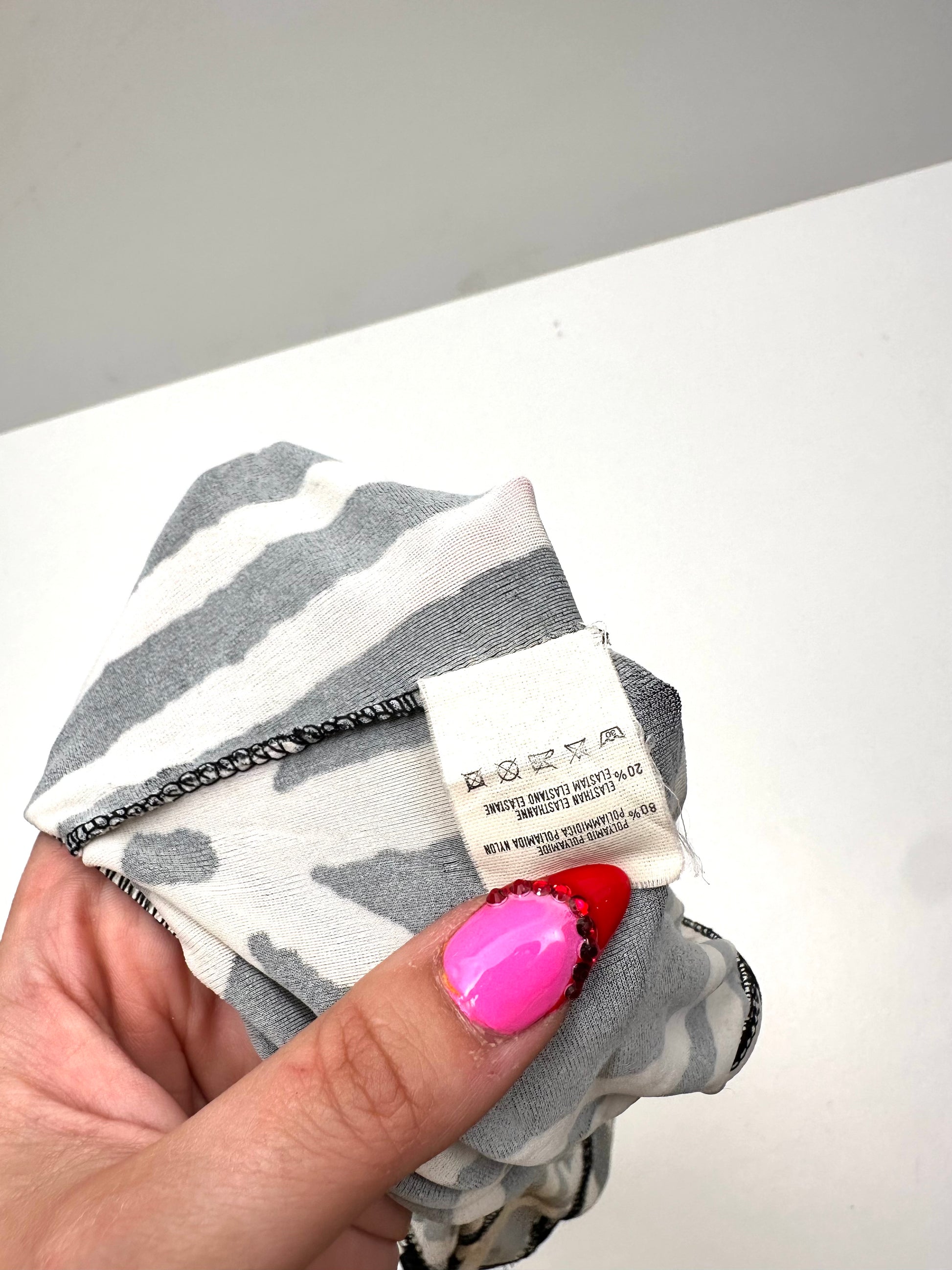 Details: This piece reminds me of the iconic 90s Versace collections. The swimsuit features underwired bust cups, high-cut legs and a low back, creating a truly iconic silhouette. On first glance, I thought this was a zebra print, but it is in fact a more organic illustrated geometric print. The lycra in this swimsuit is very lightweight and thin, and therefore more fragile than most, so this should be worn with care and stored well. There are some areas where the print has faded slightly in more high-friction places, like on the bum, I have tried my best to photograph this!